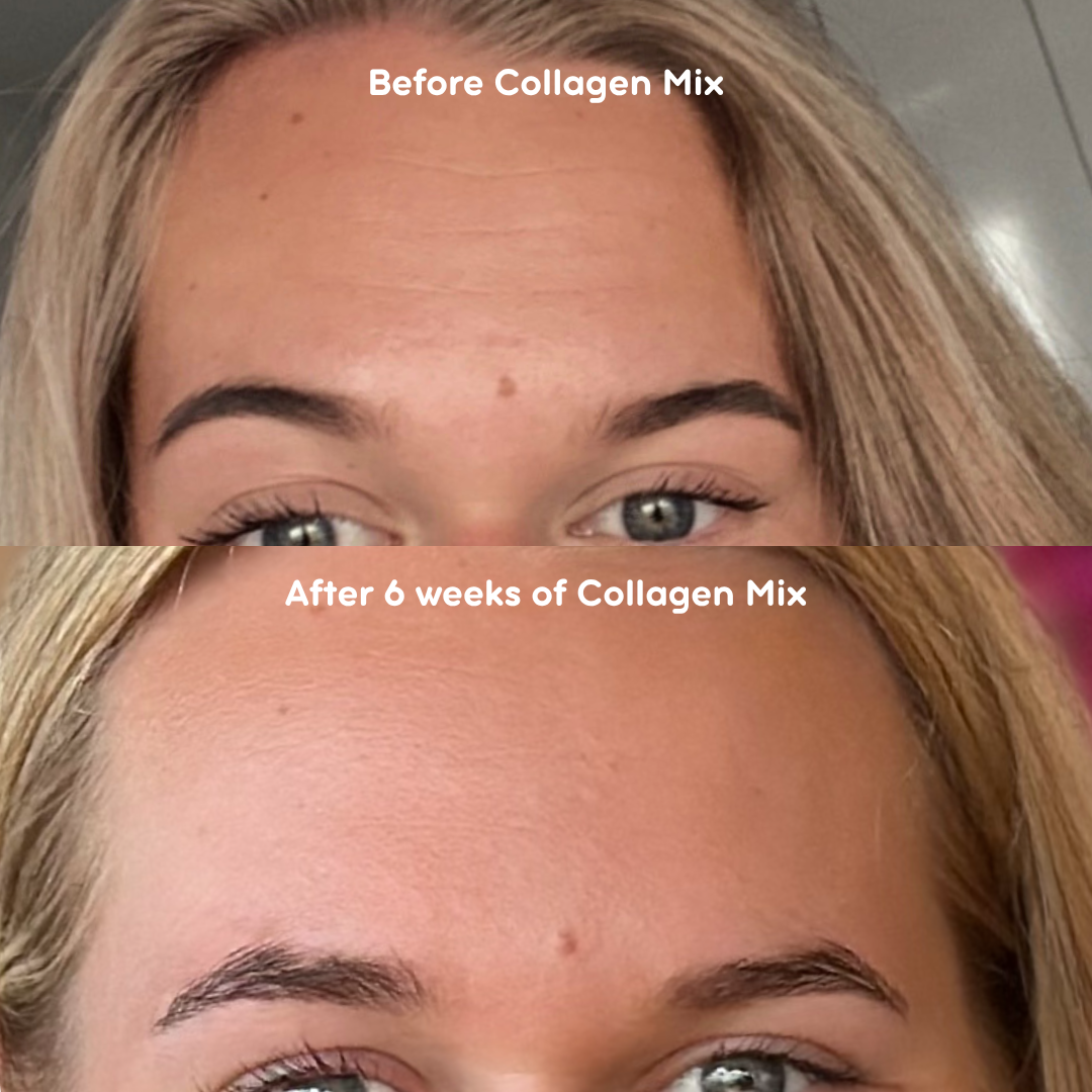 Das ist der Unterschied, den ich seit der Verwendung des Collagen Mix festgestellt habe. Meine Stirn ist spürbar glatter geworden.